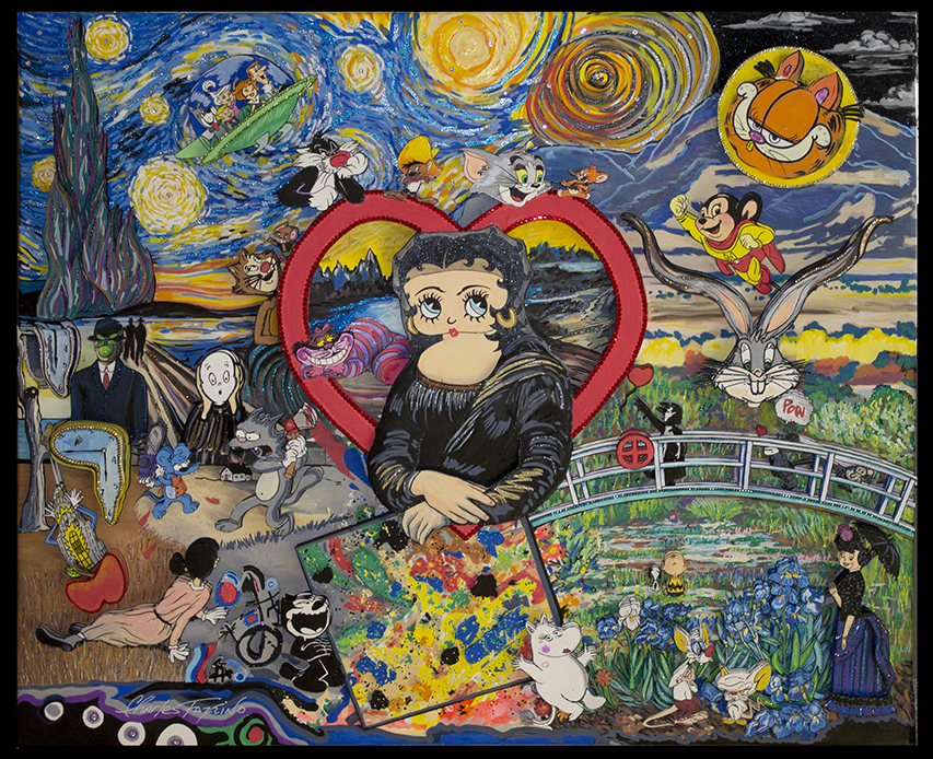 “A Cartoon Celebration of the Masters” is the most ambitious work in the show. An homage to the Masters, Fazzino seamlessly folded some of our favorite cartoon characters into the most famous scenes painted by some of the Masters, including Vincent Van Gogh, Georgia O’Keefe, Leonardo da Vinci, Edvard Munch, René Magritte, Salvador Dali, Andrew Wyeth, Joan Miró, Jackson Pollock, Claude Monet, and Georges Seurat. “This is a tribute piece,” said Fazzino. “The paintings I chose from the Masters are so incredibly recognizable….as are the characters now interwoven throughout them. It’s a meeting of two worlds with two different languages that come together in this one, intricately assembled, composition.”