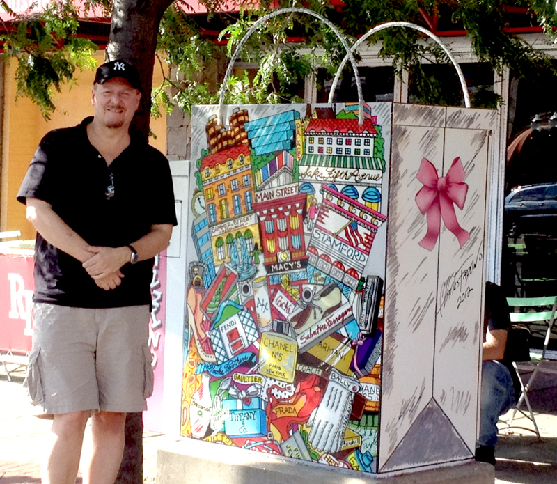 On the heels of his involvement with “Horsin’ Around Downtown,” the Stamford Downtown organization commissioned Charles Fazzino to further brighten up the landscape by painting one of the main lightboxes on the streets of Stamford, CT. Over the course of several weeks, Fazzino turned what was previously a five-foot-tall eyesore to local business owners into a beautiful piece of public sculpture. Choosing the theme of “shop downtown,” Fazzino turned the lightbox into an oversized shopping bag, bursting with vibrant colors and exciting detail. You can see the Fazzino-painted lightbox for yourself at 20 Summer St. in Stamford, CT.