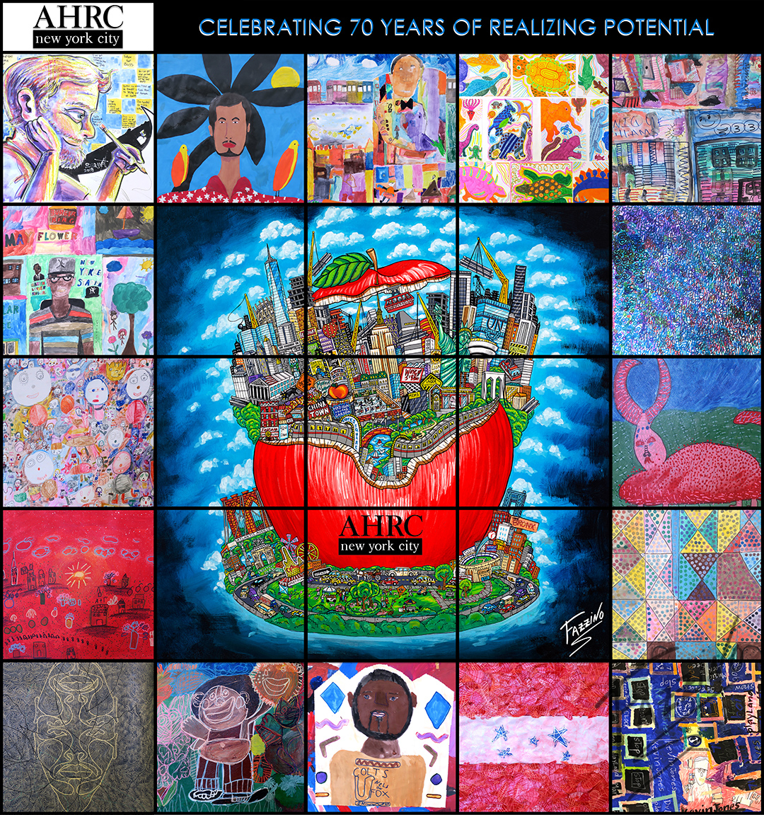 The bright, whimsical and wonderfully detailed art will be used throughout this anniversary year on invitations, posters, billboards and other materials. In it, Fazzino’s quintessential NYC Big Apple is surrounded by autobiographical paintings created by AHRC NYC self-taught artists who participate in ArTech. They are: Jayson Valles, James Tillary collaboration with Anton Spivack, Cory Tyler, Monique Williams, Antony Ferguson, Jeffrey Holloway, Shanice Valez, Gisella Montalvo, Carlos Sotomayor, Diana Varela, Kevin Jones , Wayne Anderson, Jeremy Gonzalez, Carol Fields, and Teaching Artists Ben Granoff and Carlos Encarnacion Vazquez.