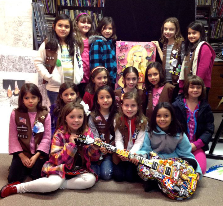 Last week, we has some special visitors at the studio – Port Chester/Rye Brook Girl Scout Troup 2899. The girls arrived with a lot of enthusiasm and energy. They took a tour of the studio given by Sales Director Fran Kessler and then worked with Charles Fazzino’s art director, Jaime Cancel, to learn how to actually glue and construct a Fazzino 3D pop artwork.