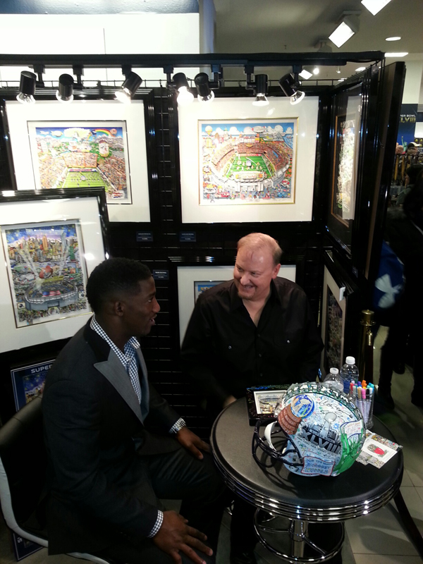 Antrel joined Charles Fazzino for an autograph signing session at the NFL Shop and hundreds of fans lined up for a signed Super Bowl poster. It was one of several highlights for Fazzino during the week, including signings with NY Jet Quinton Coples and former NY Giant Punter Sean Landetta.