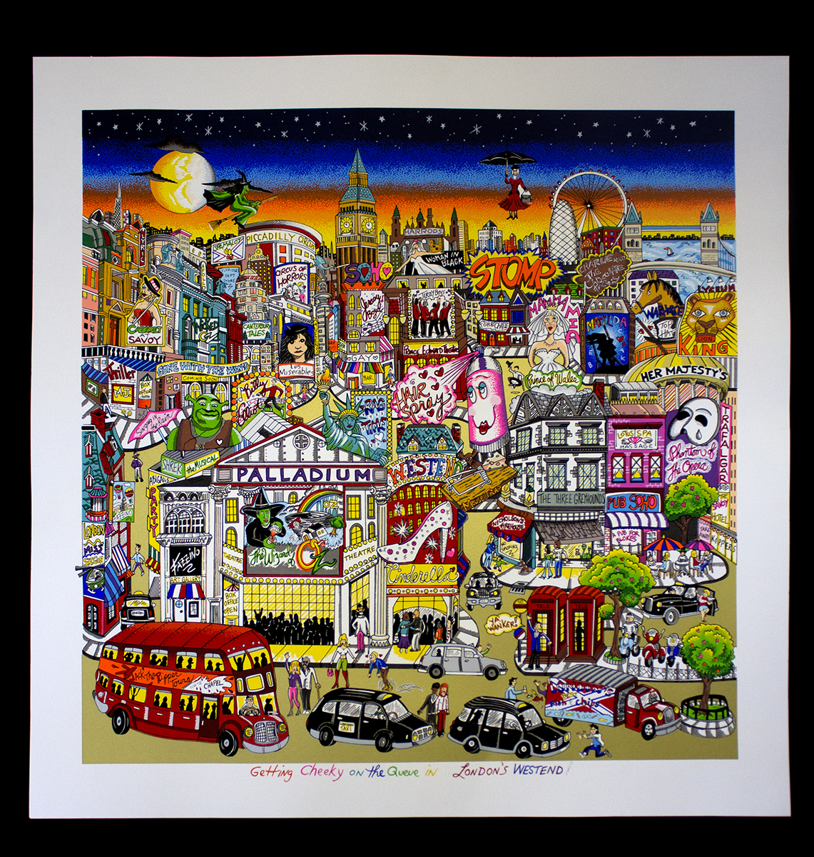 Getting Cheeky in the Queue in West End London was conceptualized by Charles Fazzino when he was in London for the Olympic Games in 2012. “I was in London for ten days, making appearances at the USA House, the American School in London, and the Procter & Gamble Family Home. I took an afternoon off to play tourist and found myself in the audience at ‘Jersey Boys” in the West End. I loved it so much and the atmosphere in that area of London reminded me so much of Broadway, that I just had to make it my next London release. I hope you enjoy it.”