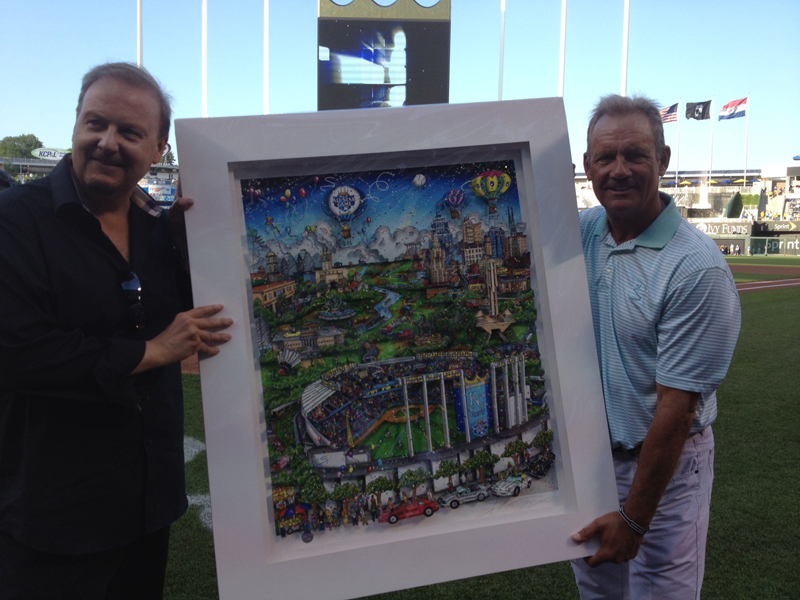 Kansas City Royals legend and Hall-of-Fame player George Brett joined Charles Fazzino at Kauffman Stadium last night before the Royals took on the Milwaukee Brewers. The two sat for an All-Star Game Poster signing at the Royals Team Store and then unveiled the All-Star Game 3D Pop Art on the field during a pregame ceremony. All of the proceeds from the poster signing are being donated to Royals Charities. A big surprise for Charles Fazzino was running into rock legend Alice Cooper on the field after the unveiling.