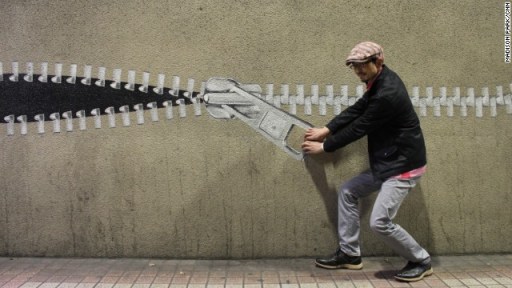 Dali had his Mustache, Warhol his Marilyn Monroe, and Michelangelo his David. Japanese artist Jun Kitagawa has his…ZIPPERS and T-SHIRTS. In some circles of Tokyo, he’s regarded as a nuisance, marking public spaces with his one-of-a-kind paintings and sculptures of zippers and/or T-shirts – an unlikely pair.He’s a bit of a hit and run artist, temporarily dressing some of Tokyo’s most famous sculptures in white t-shirts. When he’s not outfitting sculptures, he’s busy panting or sculpting giant zippers that mark the layers of reality – the zipper hides what is underneath. The Tokyo government even commissioned him to put his zipper “tag” over some illegal graffiti in the Roppongi Tunnel.