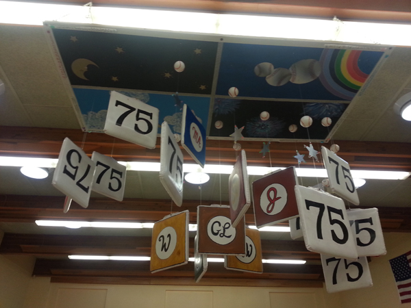 “The original idea came about while scouring the halls, rooms, and closets of the school, in hopes of finding some sort of baseball gear that was not being used. We found a box of stadium cushions that were not in use and received permission to use them. The stadium cushions now take on new life as baseball bases, they were spray painted white by Rusty Lane, who is a member of the maintenance staff. On one side the 75th anniversary is recognized by painting 75 with black acrylic paint with a top coat of shimmer. On the opposite side of the “base” each of the 16 regions around the world is recognized for their participation in Little League.