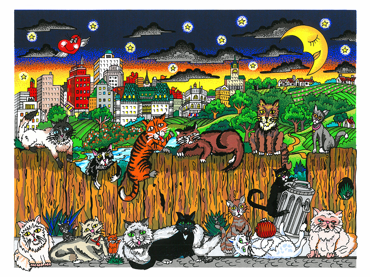 Charles Fazzino’s latest 3D pop art limited edition release pays tribute to our furry feline friends, hangin’ out by the light of the silvery moon! You can even have your own cat inserted into the mix. If you’re brave enough, you can visit our “Color Your Own Fazzino” page and take a shot at it!