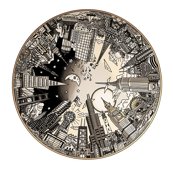 “I just CANT get enough of these colors! This year I decided that I wanted to do something different, but still artwork that speaks to and inspires people the same way it always has. That’s where the idea for using these metallic colors came from. While most people love a bright, sunny day, the nighttime is also incredibly beautiful – that’s where the term MOONSTRUCK came from…and I hope you are moonstruck when you look at this piece…by the colors and by the theme of unification. It shows that no matter where you are in the world, whether it’s night or day, we all share the same world. A circle is the symbol for unity and continuation, as I hope my artwork will be for all who view or collect it.” – Charles Fazzino