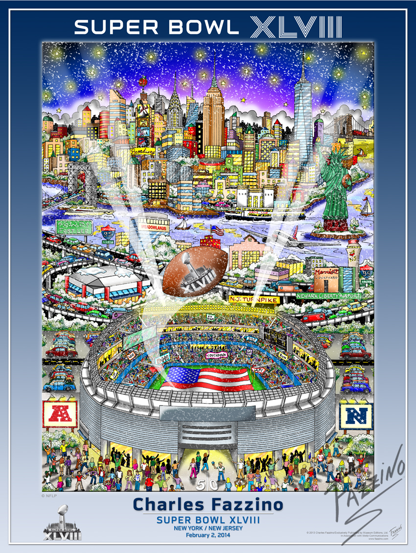 On the Fourth Day of Fazzino, we offer to you…20% off the Charles Fazzino Super Bowl XLVIII Poster. History will be made on February 2, 2014 when the NFL plays its first Super Bowl in New York/New Jersey. Fazzino is celebrating this exciting event with his 14th Super Bowl fine art poster. It measures 18″ x 24″ and captures the scene as he imagines it will be on that memorable Sunday afternoon. MUST ORDER BY December 18th for Christmas delivery.