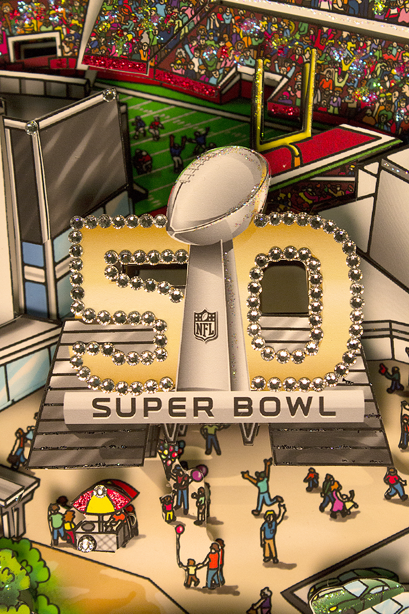 With the NFL season well underway, it’s already time to look at ahead to what what will become one of the biggest milestones in American sports history – Super bowl 50 which takes place on Sunday, February 7th, 2016 in San Francisco! The National Football League is already celebrating the Golden Anniversary of the most-watched sporting event of the year, and Charles Fazzino is proud to announce the release of his Super Bowl 50 Art Collection. Fazzino, who has commemorated the last fifteen Super Bowls for the NFL has something extra special planned for this one. “It’s the Golden Anniversary for Super Bowl. It’s historic,” said Fazzino. “So, I wanted the artwork to reflect that. We’ve incorporated lots of Swarovski crystals into the edition, as well as gold accents and embellishments. The footballs on the premiere edition will even be embellished with 24-karat gold leaf. We wanted this edition to be very, very special. I’m looking forward to showing it in San Francisco.”