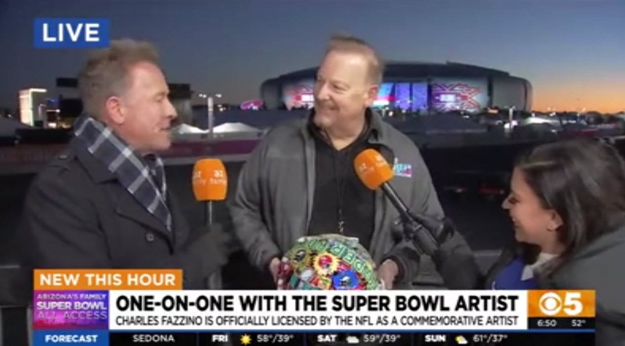 CBS 5 met up with Fazzino outside the State Farm Stadium in Phoenix Arizona to talk about what it’s like being the official artist of the Super Bowl. Learn about how the hand-painted helmets and limited edition prints are made and how the Arizona landscape inspired the details that where included in this year’s colorful work.