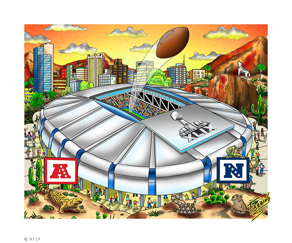 For the 15th year in a row, Charles Fazzino released his artwork for Super Bowl XLIX which takes place on February 1, 2015 in Phoenix, Arizona. His entire Super Bowl art collection will be on display and available for sale in Phoenix at the NFL Shop inside the NFL Experience at the Phoenix Convention Center beginning on January 24, 2015. As always, the collection will consist of limited edition 3-D art prints, hand-painted football helmets, open edition mini prints, and poster prints. The Shop will be open to the public and you will not need an NFL Experience ticket to enter. It will all be part of the Verizon Super Bowl Central football fan part in downtown Phoenix