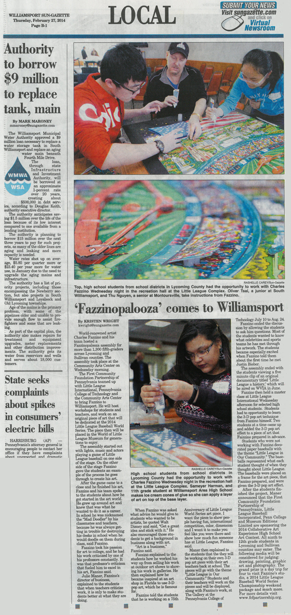 While in Williamsport, PA in late February, Charles Fazzino conducted two student art workshops – one for high school-aged kids and one for the fifth graders in Lycoming County. In both cases, the kids worked with Fazzino to create a composite artwork including his work and theirs. The fifth graders worked on the original painting Fazzino is creating for the 75th Anniversary of Little League Baseball. That work will be unveiled during the Little League World Series in August and then permanently installed in the World of Little League Baseball Museum.
