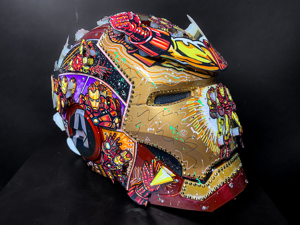 A one-of-a-kind mixed-media entertainment helmet sculpture based on a life sized replica Iron Man helmet, featuring imagery of the iconic Marvel character. Hand-painted and embellished with Swarovski Crystals, Glitter, and a variety of 3D elements.