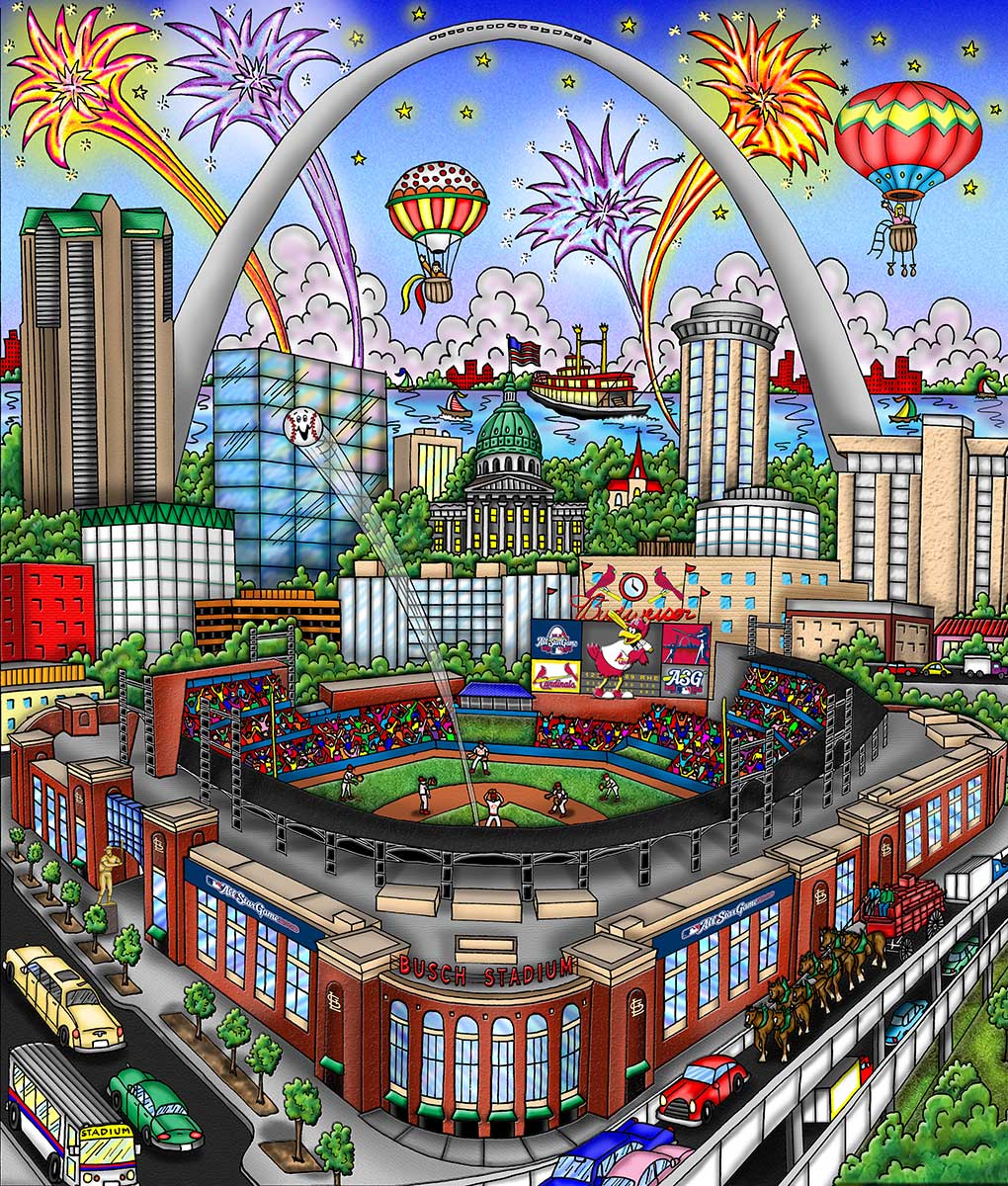Charles Fazzino’s officially licensed commemorative artwork for the 2009 Major League Baseball All-Star Game in St. Louis. The game took place on July 14, 2009 at Busch Stadium, home of the St. Louis Cardinals. The legendary Jack Clark signed posters with Fazzino after he threw out the first pitch before a Cardinals home game. The artist also conducted an interactive art project with Cardinals’ fans on the concourse at Busch Stadium.