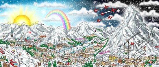 One of the most spectacular mountain ranges on earth, filled with snowy forests and the finest trails for skiing. Fazzino brings the Winter Wonderland that is the Swiss Alps to life in his signature 3D Pop Art fashion.